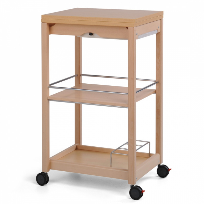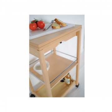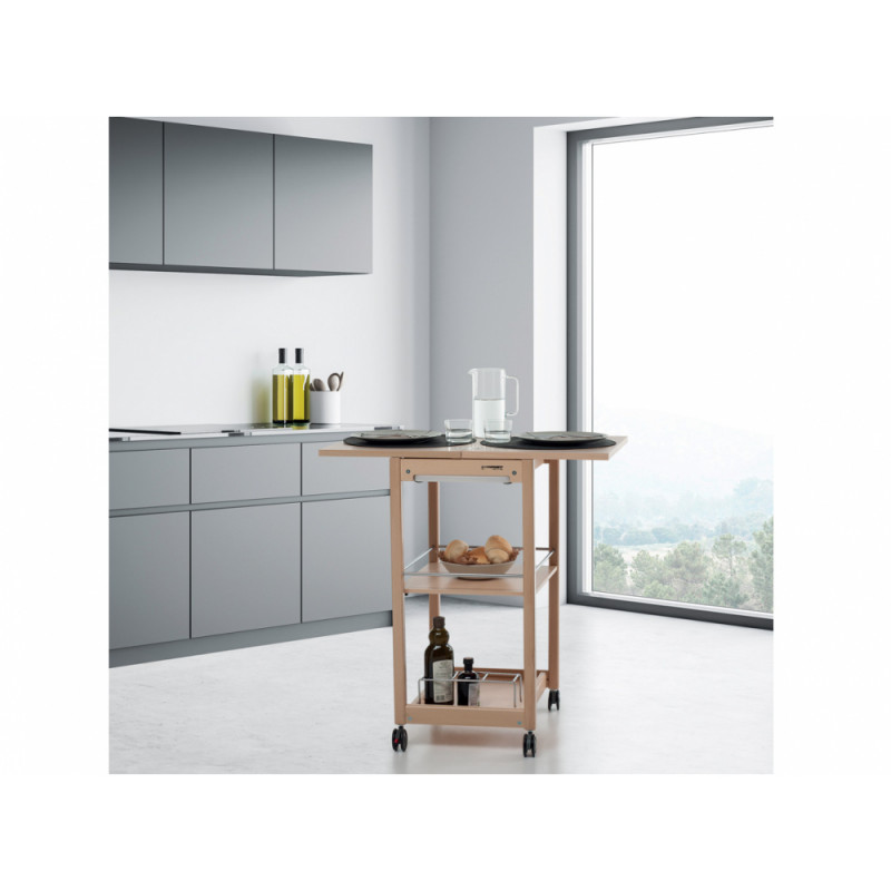 Il carrello da cucina in legno Servi-tu di Foppapedretti si trasforma in un tavolo per due persone. Servi-tu mette a disposizione tre comodi ripiani: il piano di lavoro superiore è raddoppiabile, si trasforma in tavolino ed è dotato di tagliere estraibile; il piano centrale può ospitare gli utensili da cucina; il piano inferiore si completa con una griglia in metallo porta condimenti e bottiglie.